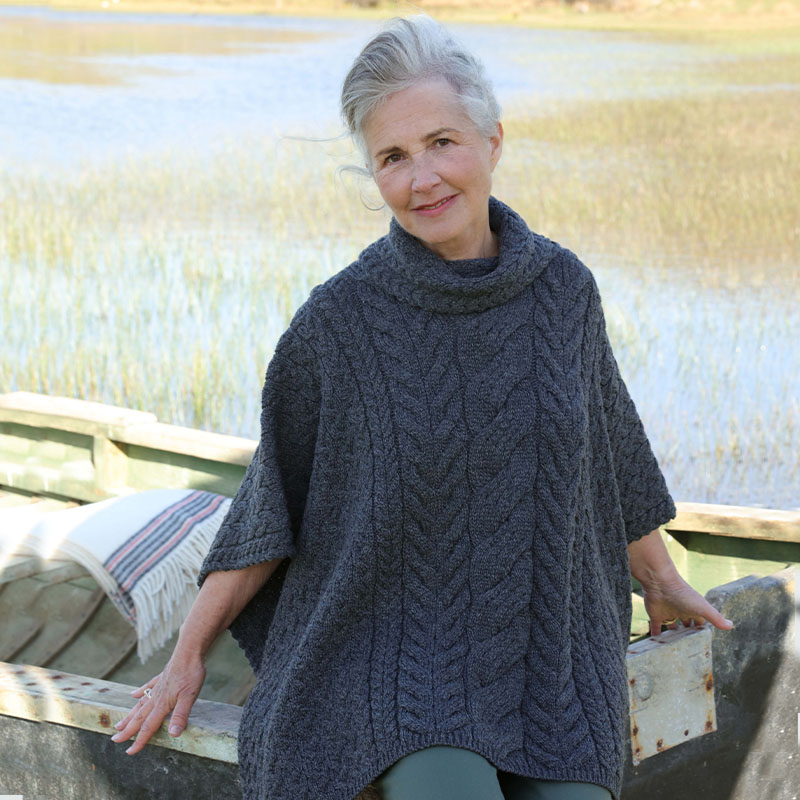 The different knitting stitches that form the different distinct patterns in the wool are inspired by generations of Aran fishermen, their families, and the history of their lives at sea. The cable patterns in our poncho are reminiscent of the ropes the fishermen use to haul in their catches, with wishes for safe travels and bountiful days at sea. The plaited or braided cables that adorn our poncho not only create a wide, dramatic expression of the design, but they also symbolize the interweaving strands of life—the importance of how various people and elements interact to create one big, beautiful world.
