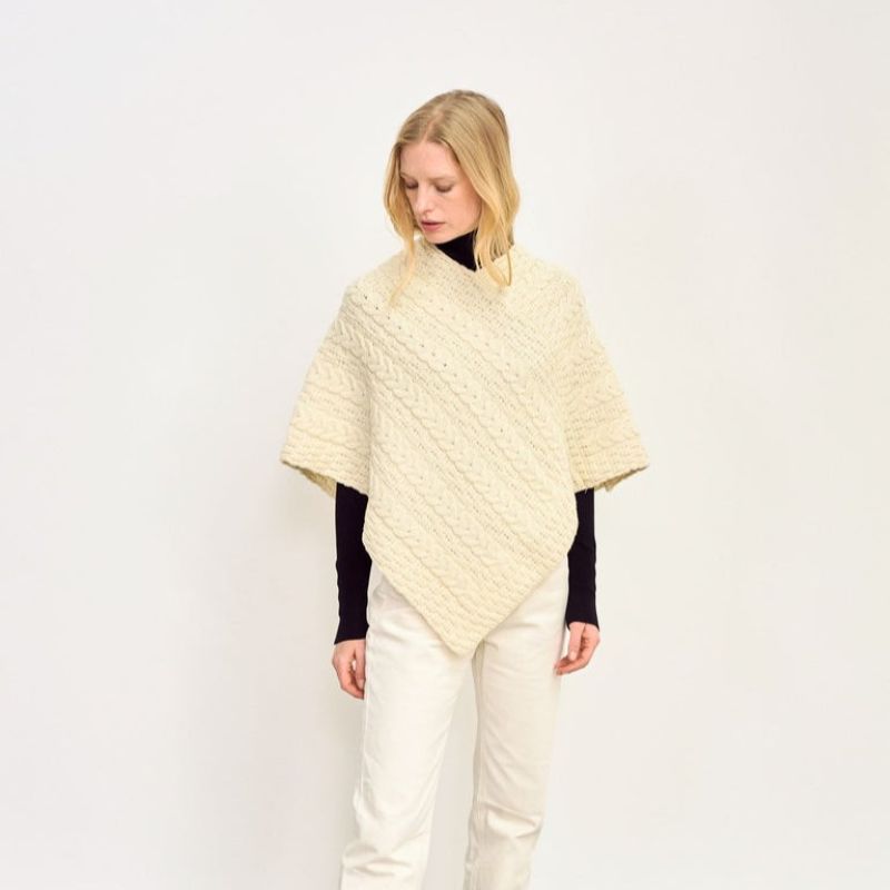 This modern design is beautifully combined with traditional Aran stitching patterns such as the cable, a symbol of safety and good fortune; and the basket stitch, which represents success, luck, and prosperity. You can style this poncho in various ways, so it would make an elegant and versatile addition to your wardrobe.
